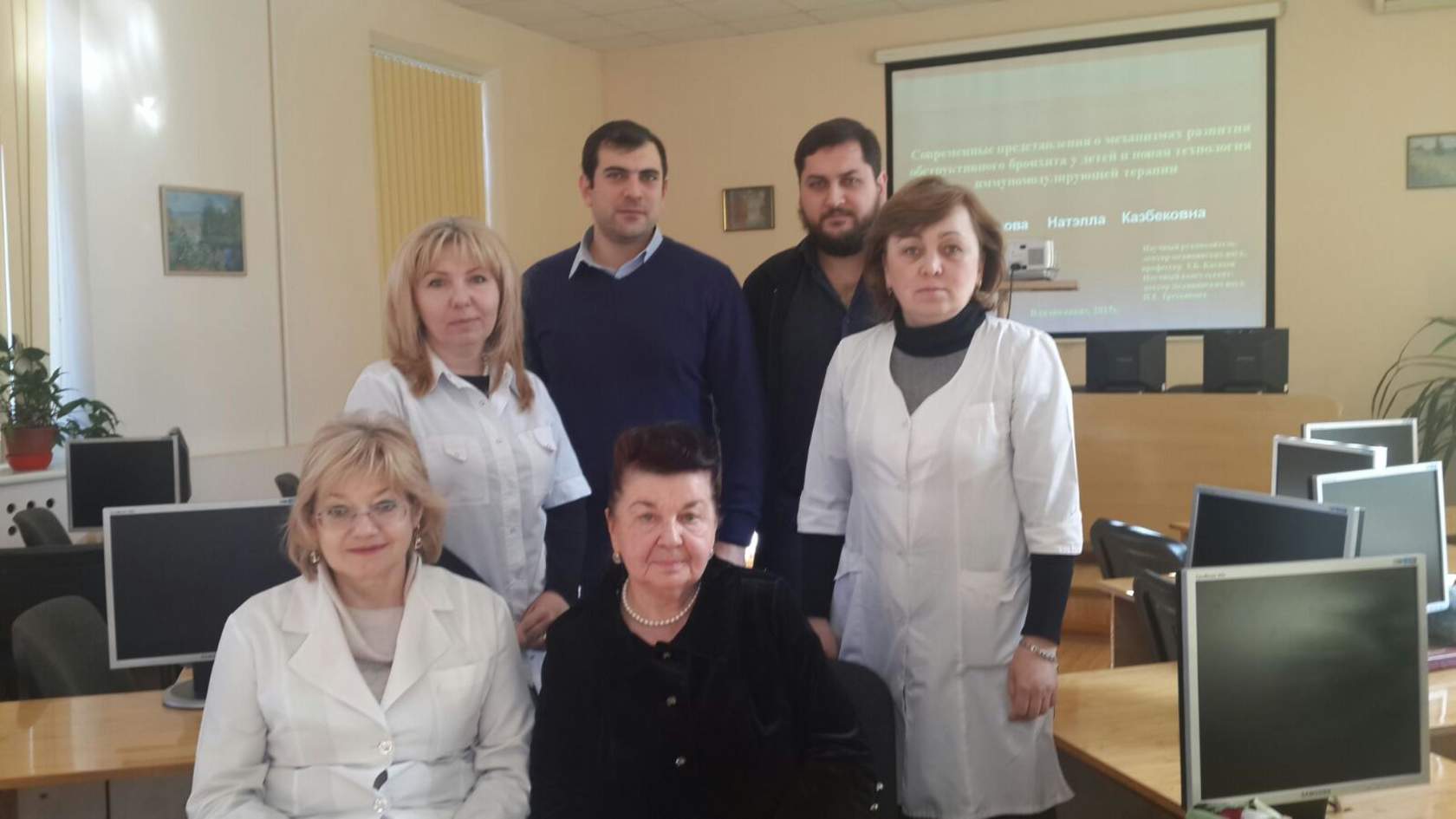 2 ряд: к.м.н. А.Е. Хубулова, в.н.с., д.м.н., зав. отделом С.Г. Дзугкоев, м.н.с. А.А. Беленчиков